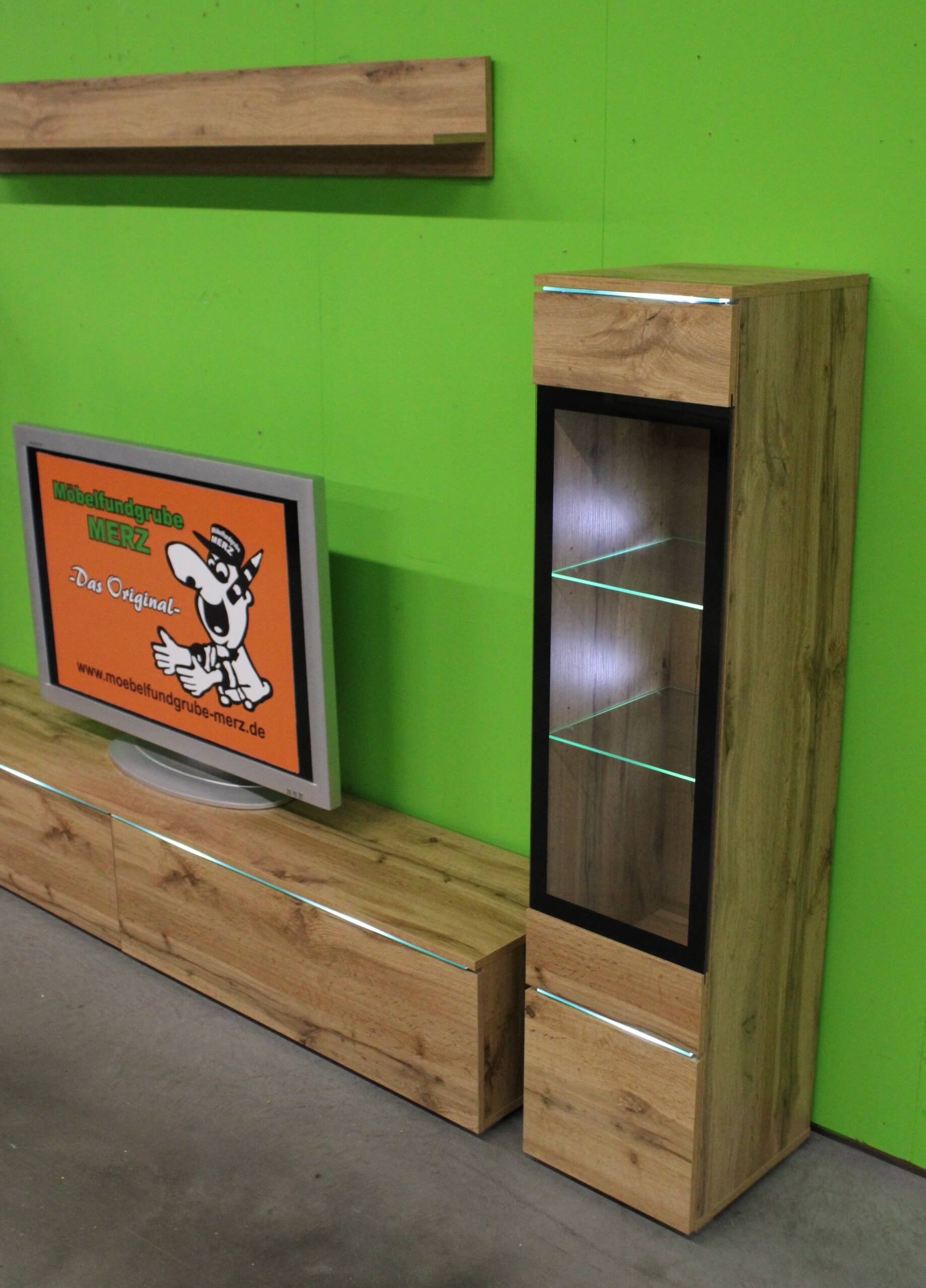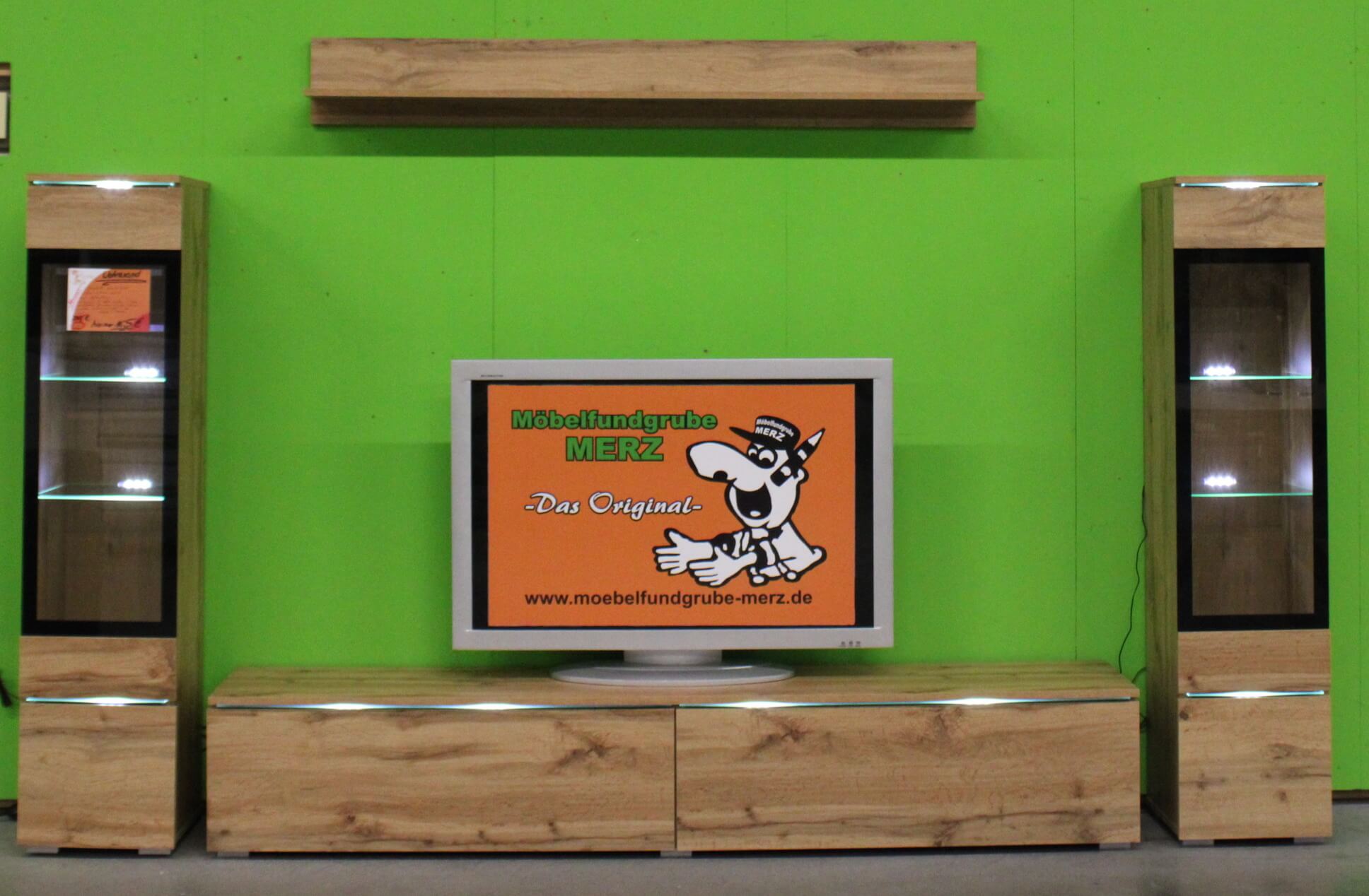 bestehend aus:2x Vitrinenelement mit jweils 2 Türen1 TV-Unterteil mit 3 Klappen1 Wandregal